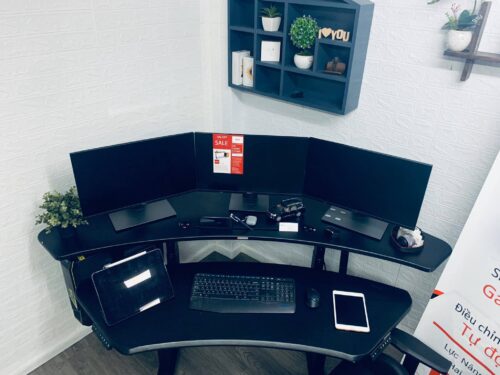 Với mặt bàn kép kích thước rộng có thể chứa tối đa 3 màn hình mở rộng , độ cong 90 độ có thể bố tri ngay góc tiết kiệm được không gian cho căn nhà của bạn .